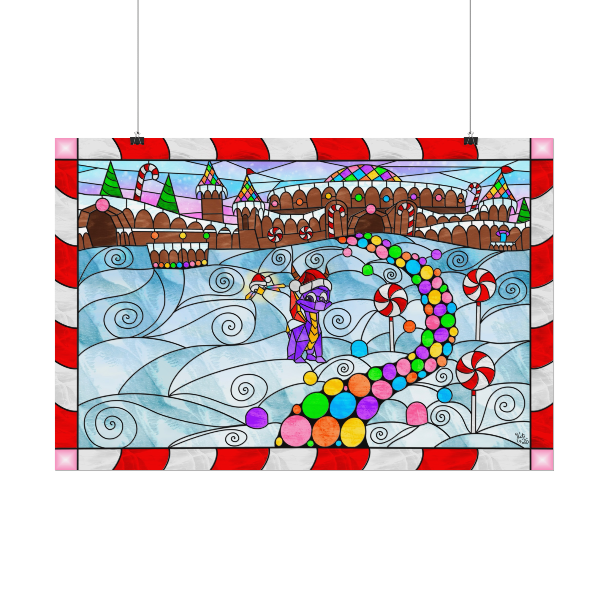 Bring festive magic and whimsical charm to your space with this stained-glass–style digital landscape poster featuring a snowy holiday candy kingdom. A glowing gingerbread castle rises from a sparkling winter wonderland, surrounded by candy-inspired details, frosted pathways, and soft snowfall that gives the entire scene a cozy, storybook feel. A small, friendly dragon adds a sense of warmth and wonder, making this artwork both playful and enchanting.