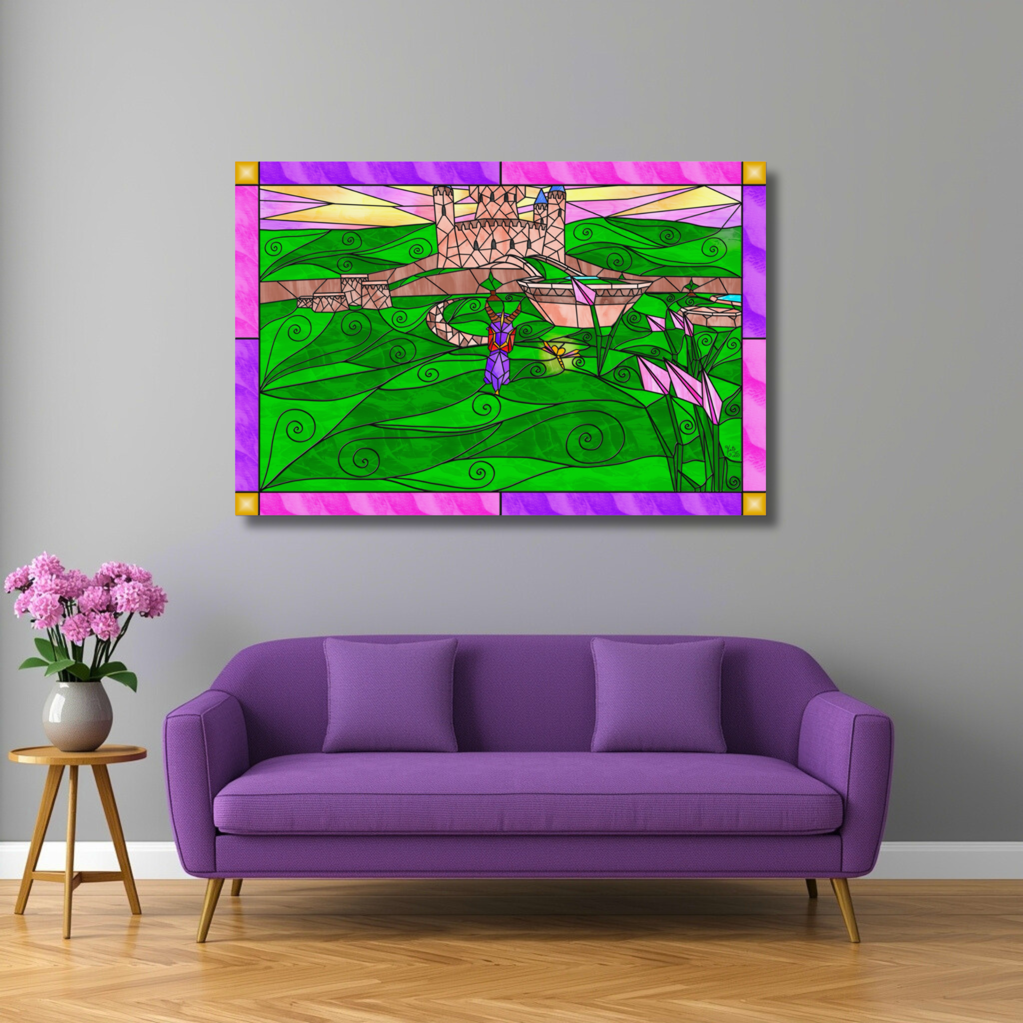 Elevate your space with this vibrant stained-glass–style fantasy landscape featuring a gentle young dragon wandering through a serene artisan-inspired world. This piece is my original digital artwork, created in my signature blend of whimsical, fantasy, and stained-glass aesthetics.