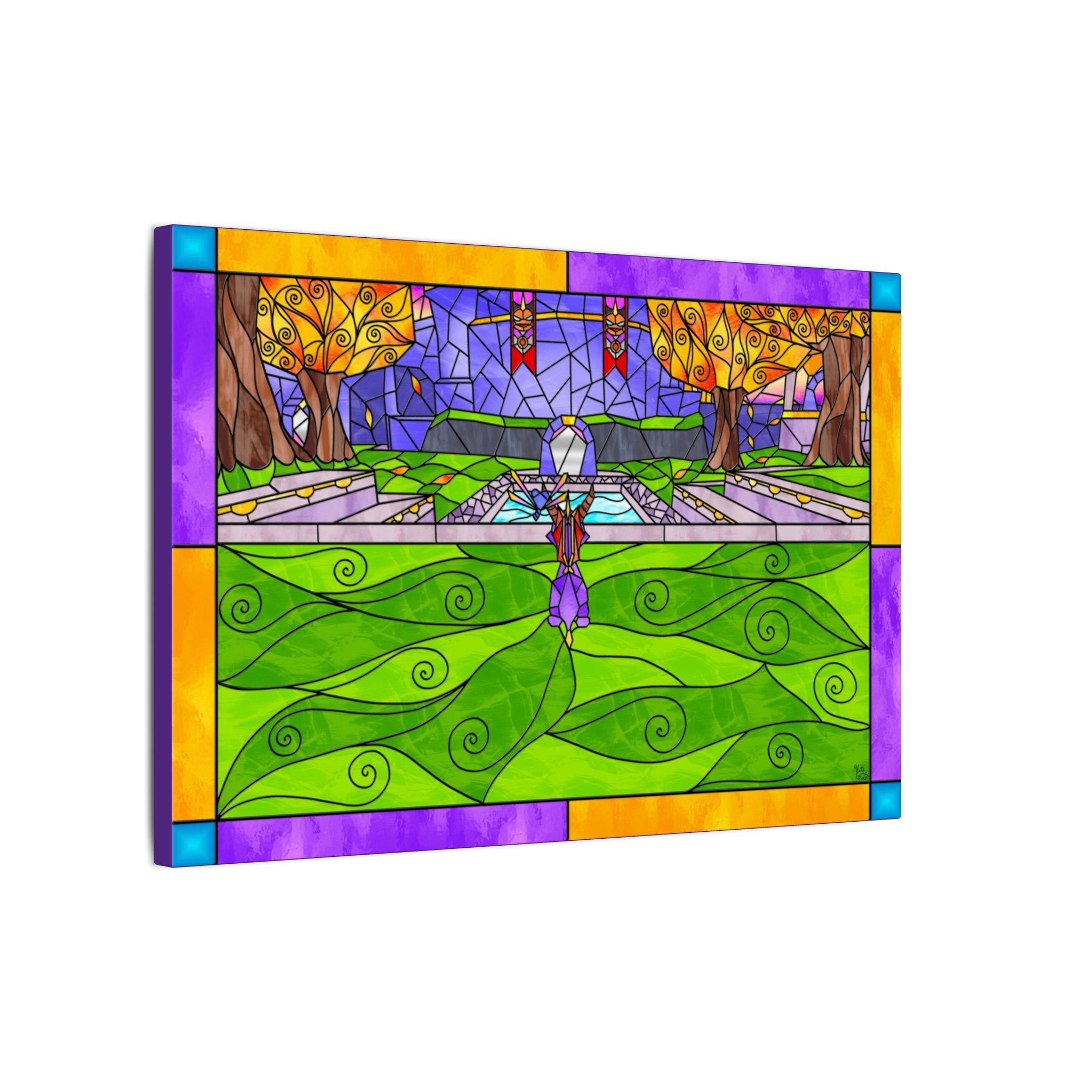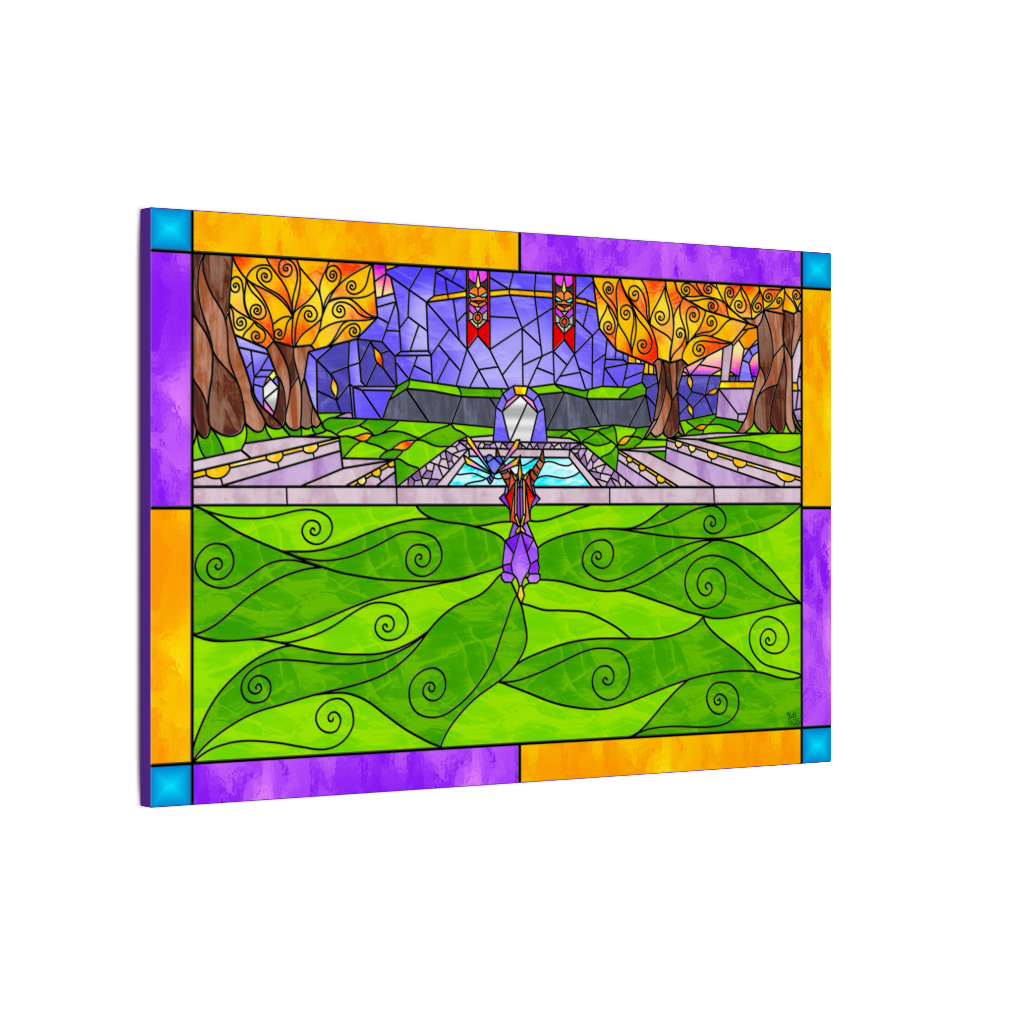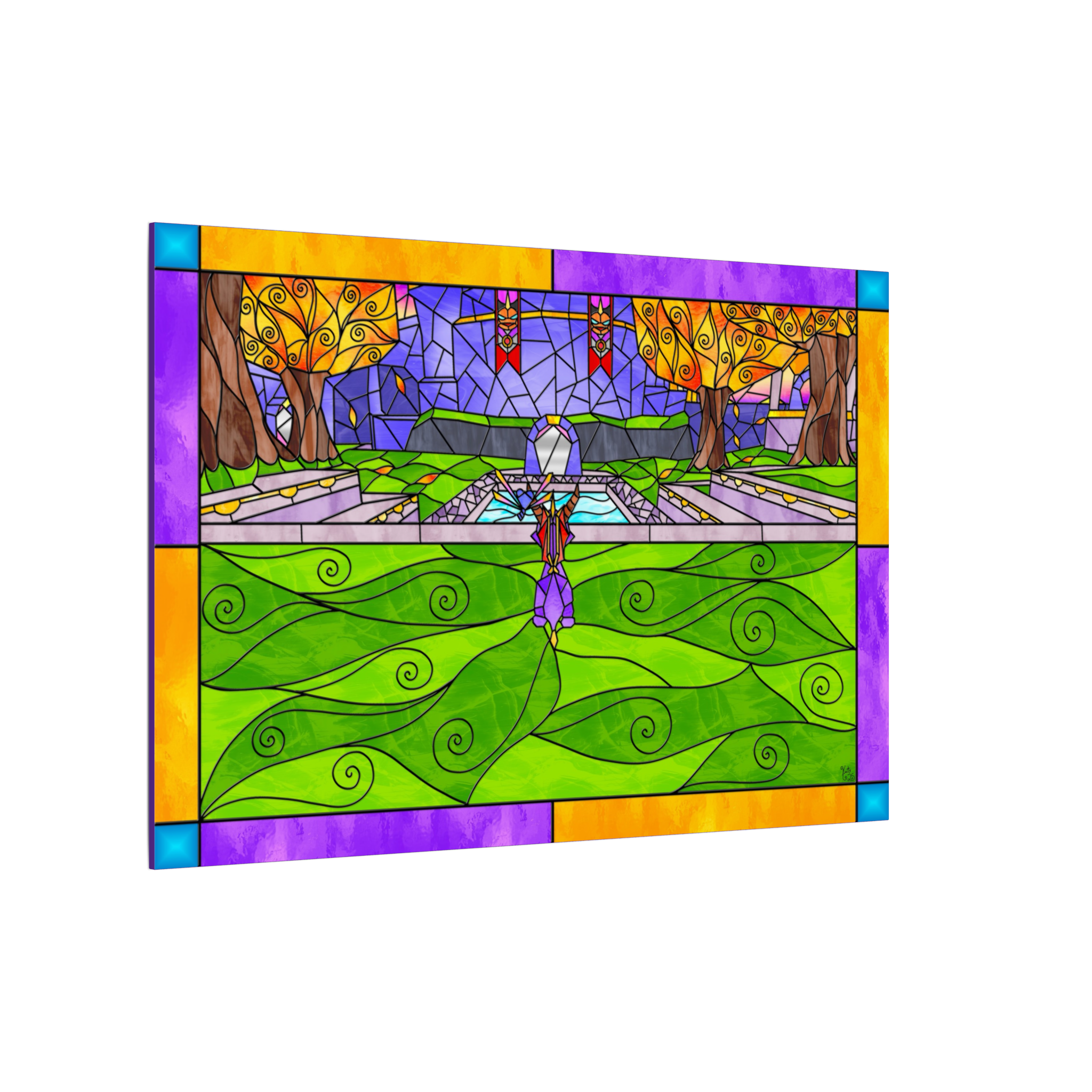 Bring the serene beauty of a golden autumn world into your home with this stained-glass–style digital landscape. Rolling plains, glowing fall foliage, and quaint structures dot the horizon, capturing a peaceful, whimsical atmosphere full of warmth and charm. The glowing jewel-toned panes of the stained-glass style enhance the richness of the autumn palette, giving the scene depth and vibrancy.