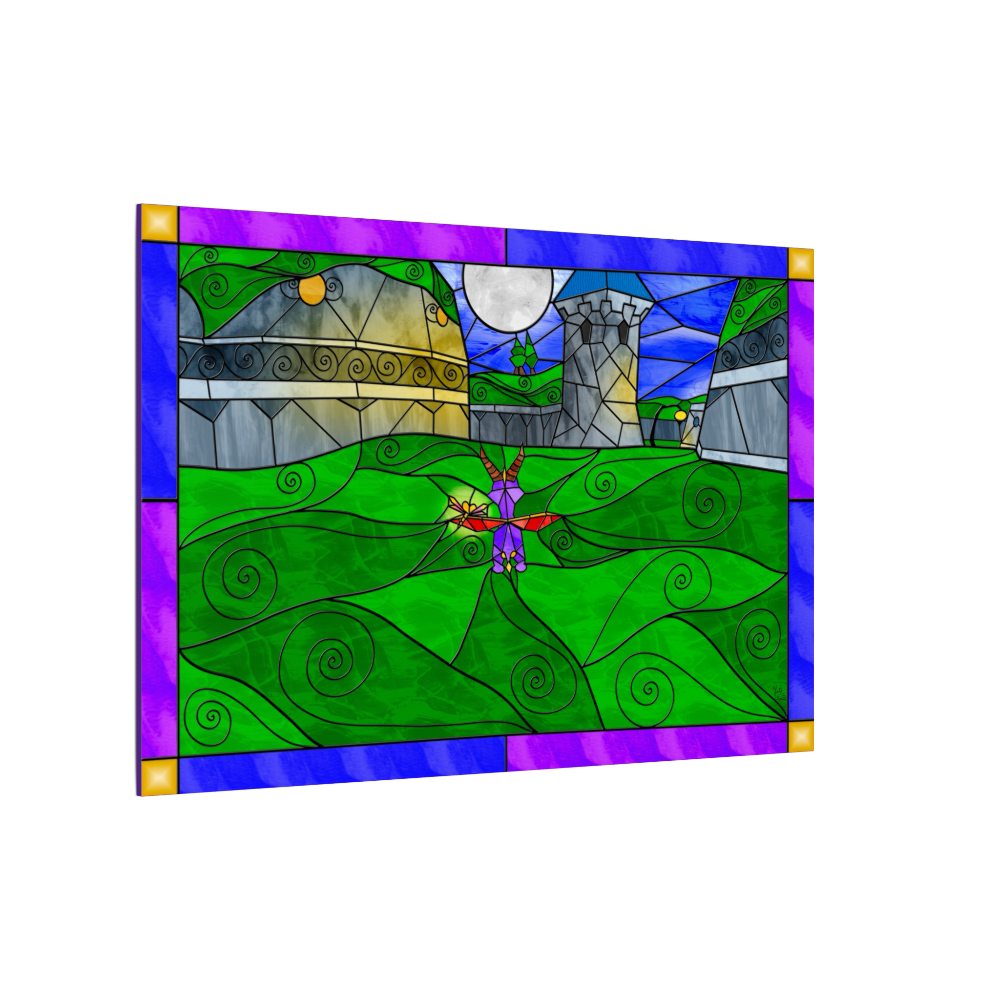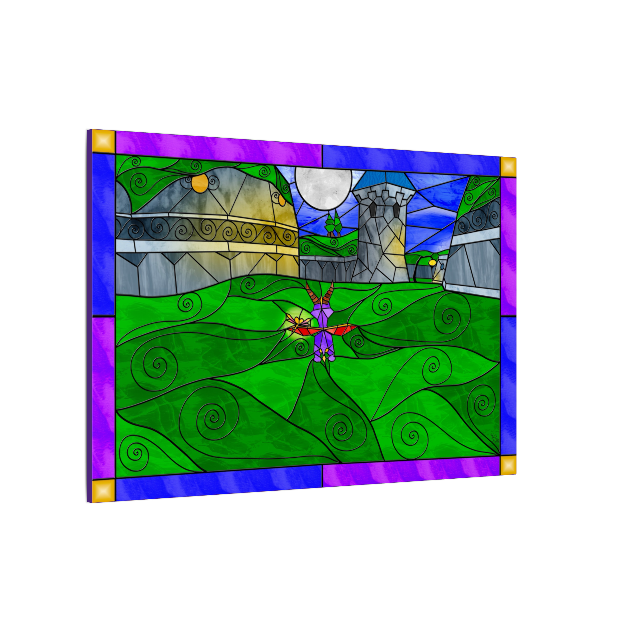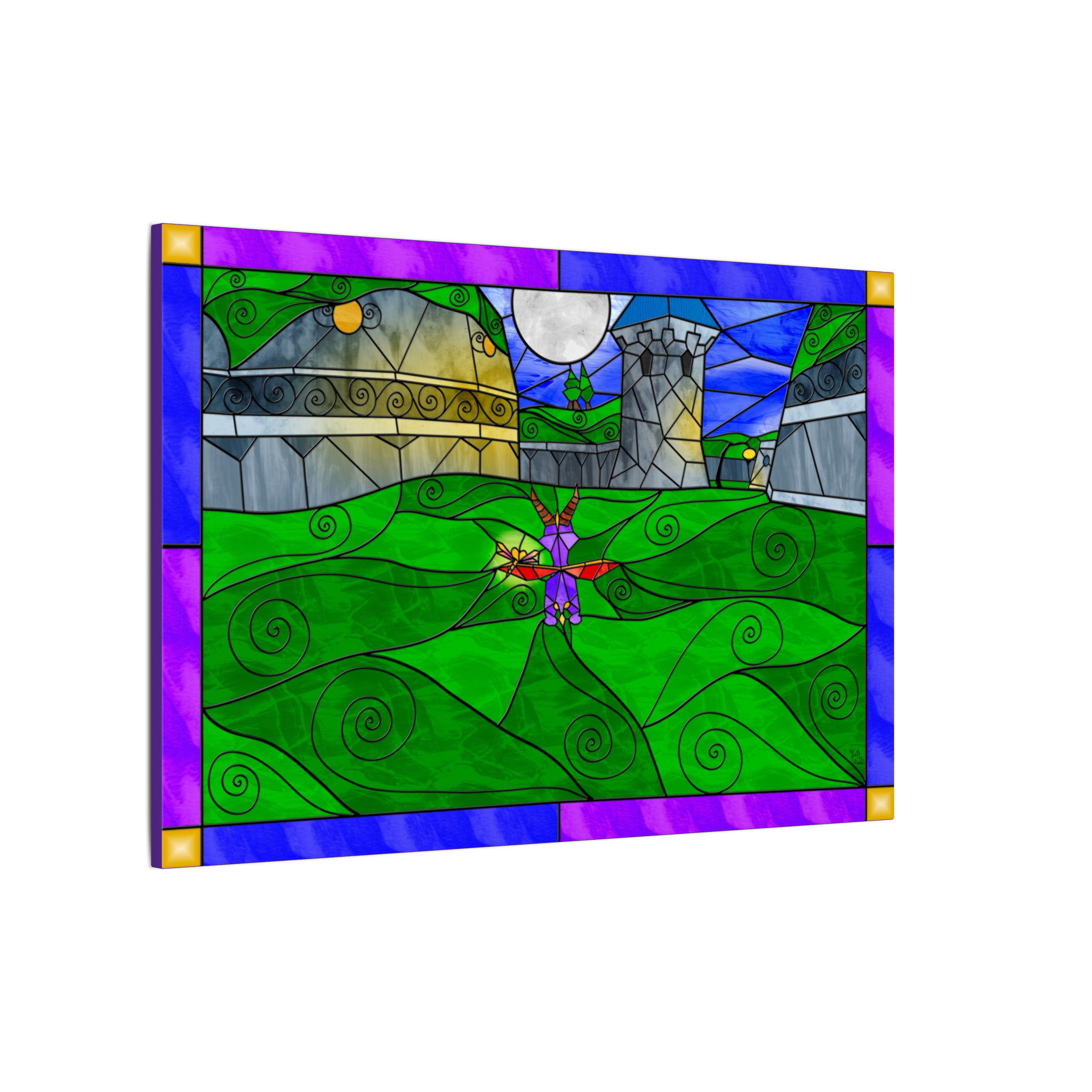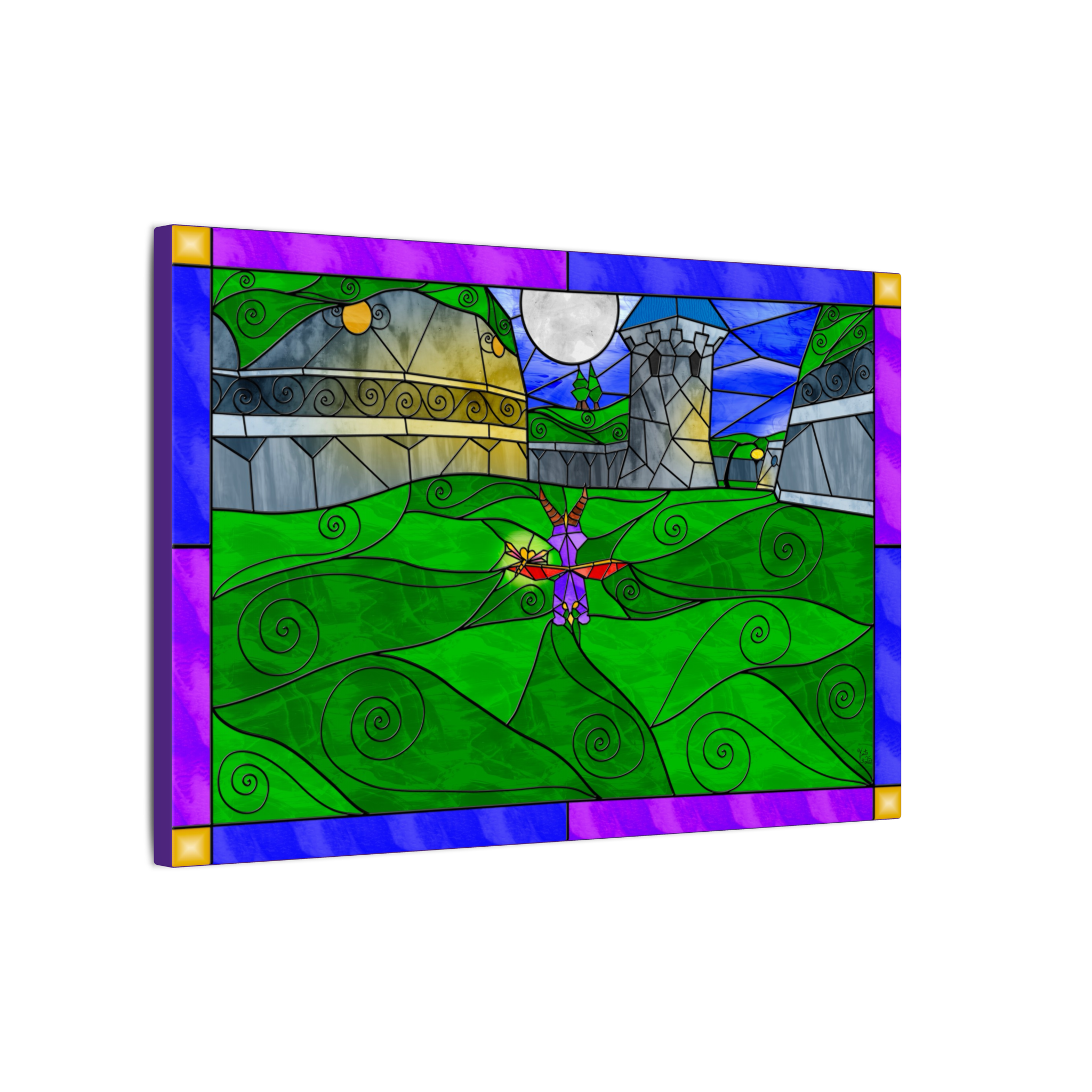 This canvas features my personal digital artwork, created in my unique stained-glass fantasy style. Every element—from the reflective nighttime shadows to the gently glowing windows and the dragon’s soft silhouette—was crafted with care to capture the quiet magic of a hidden nighttime refuge.