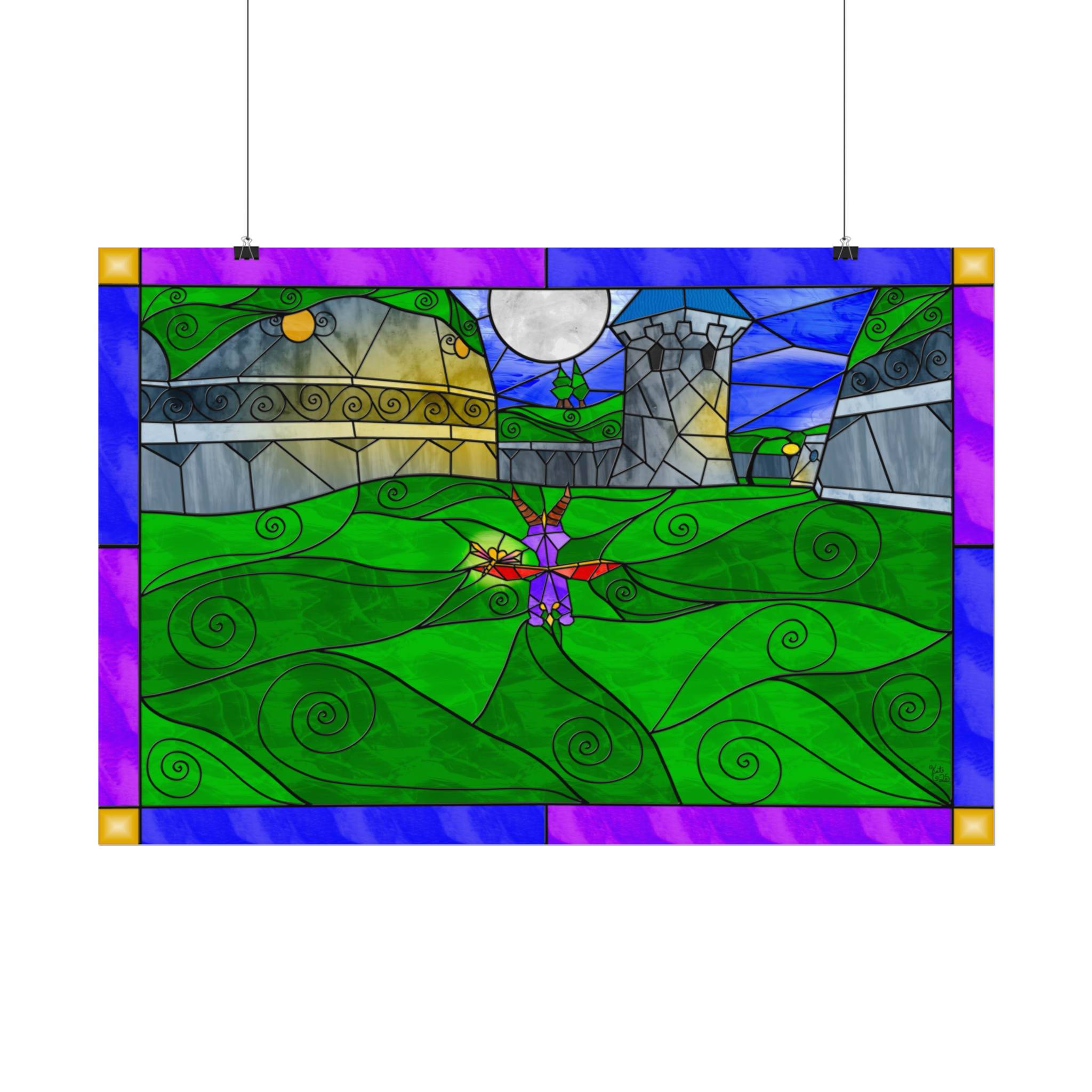 This poster features my personal digital artwork, created in my unique stained-glass fantasy style. Every element—from the reflective nighttime shadows to the gently glowing windows and the dragon’s soft silhouette—was crafted with care to capture the quiet magic of a hidden nighttime refuge.