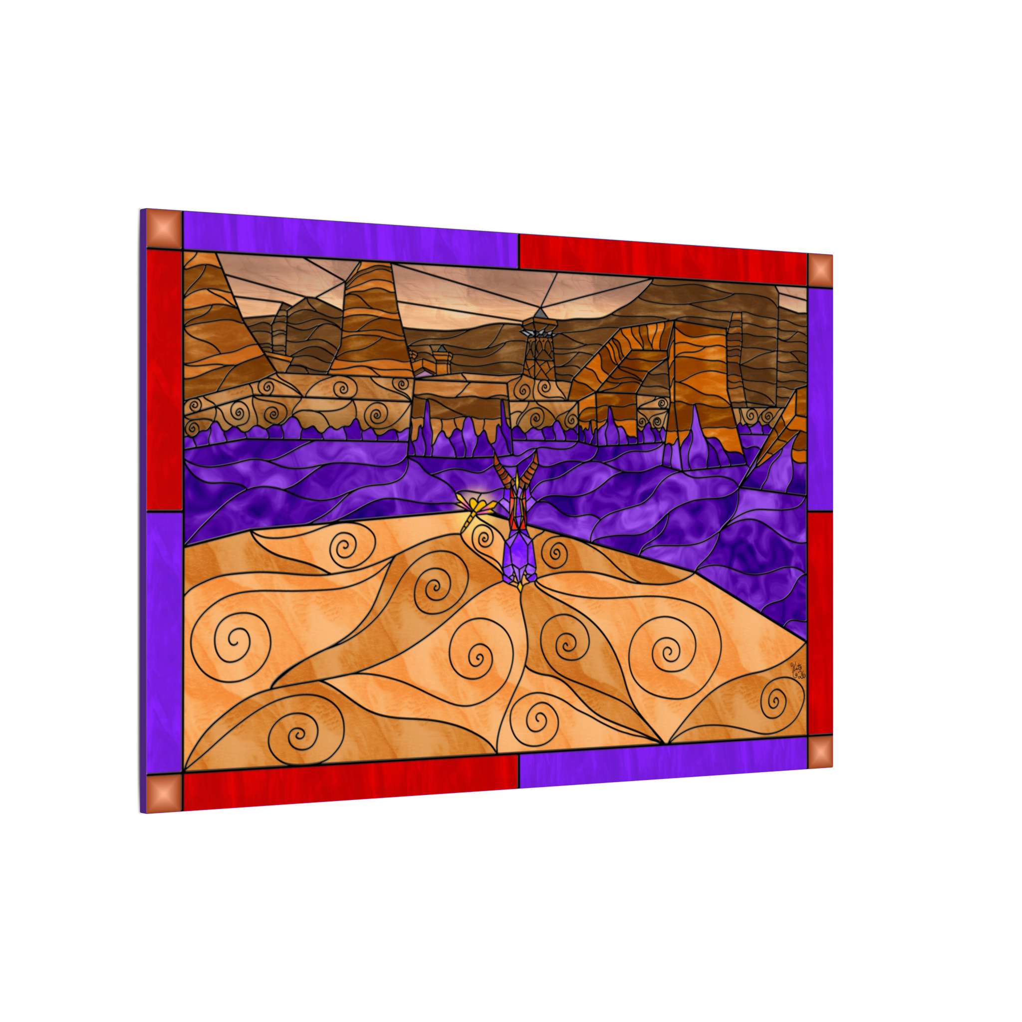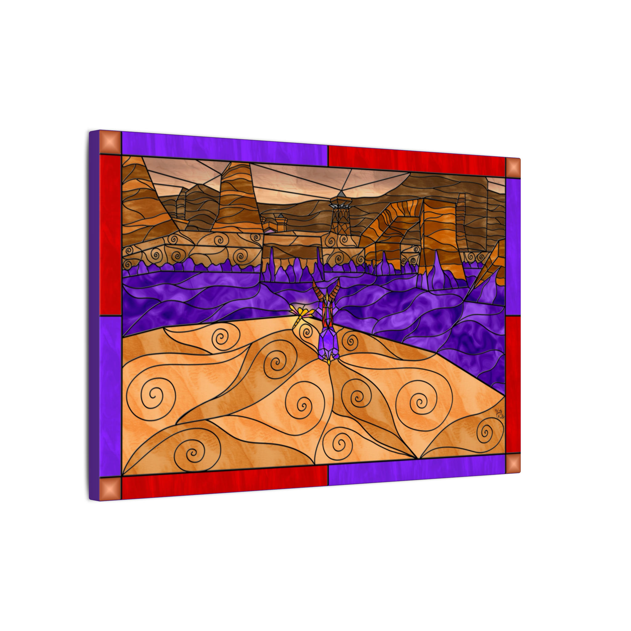 This canvas showcases my personal original artwork, created entirely by me in my signature stained-glass fantasy style. Every canyon wall, desert detail, and glowing color pane was carefully illustrated to capture the heat, openness, and quiet strength of a desert world. This is one-of-a-kind art made entirely by me, ensuring your piece is truly unique. Each canvas also includes my artist signature, adding authenticity and a personal finishing touch.