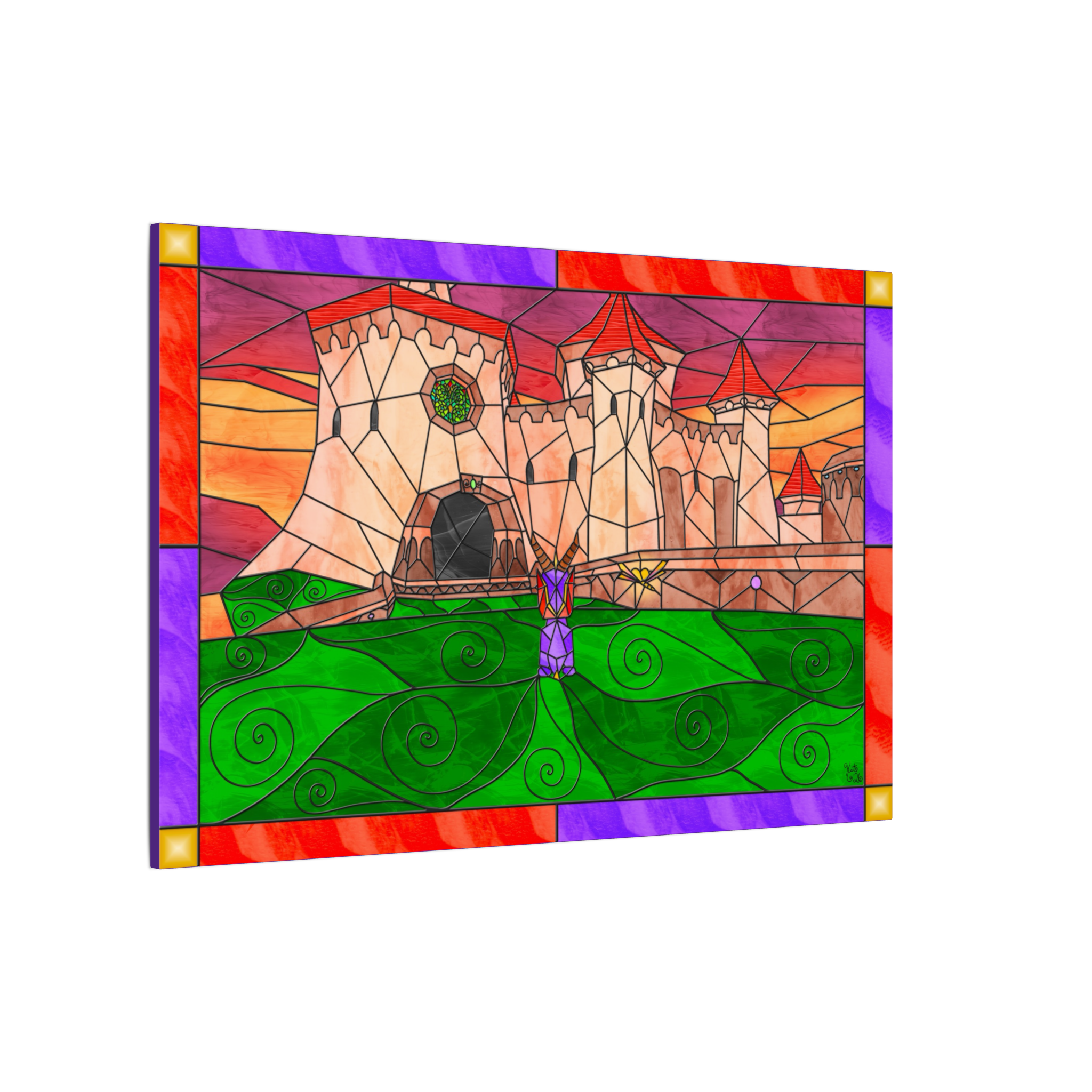 Bring dark fantasy elegance into your space with this stained-glass–style digital landscape featuring a small dragon standing before a towering castle. The castle is adorned with a glowing stained-glass window that radiates light against a dramatic orange and purple sky, creating a moody, storybook atmosphere filled with mystery and magic. Rolling terrain, soft fog, and jewel-toned highlights complete the scene, giving it a rich gothic fantasy feel.