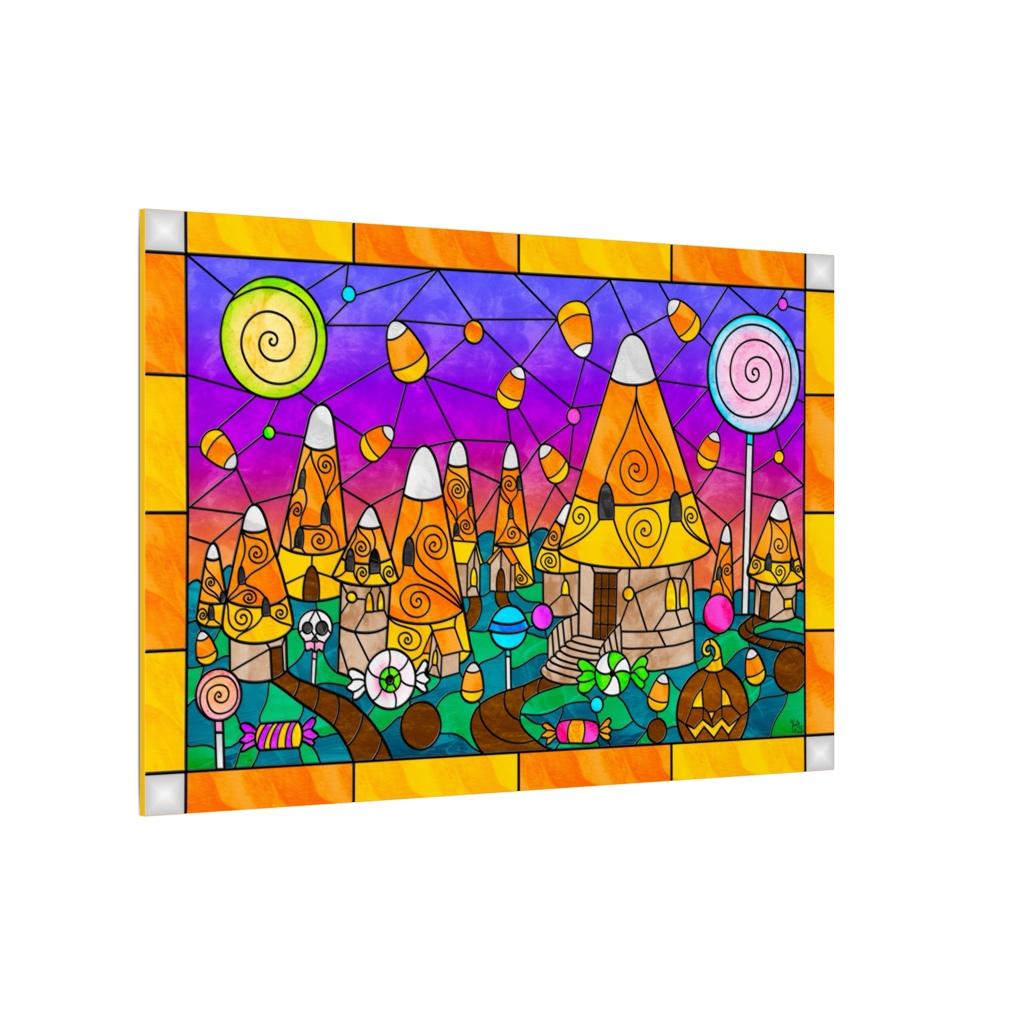 This canvas showcases my personal digital artwork, created in my signature stained-glass fantasy style. Every candy house, swirling lollipop, and glowing detail was illustrated with care to evoke the joy and enchantment of a Halloween wonderland.