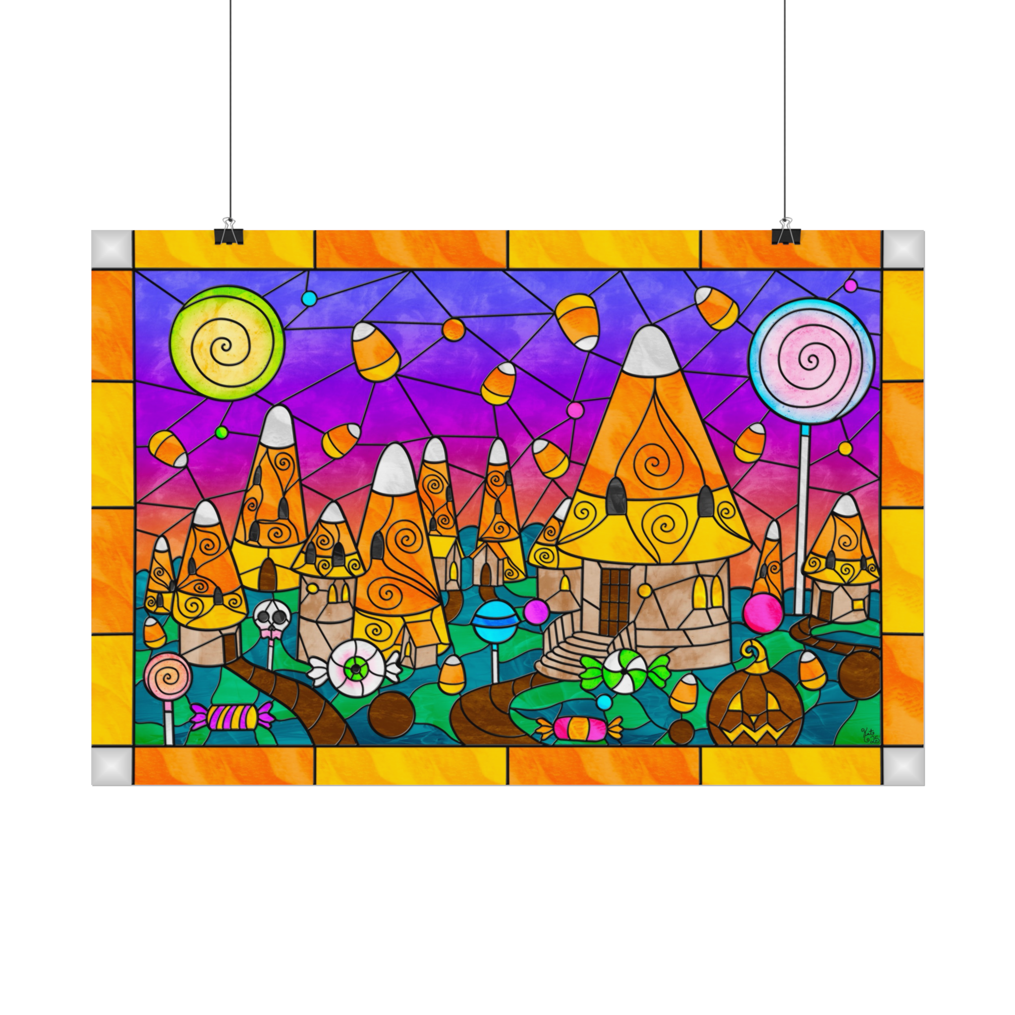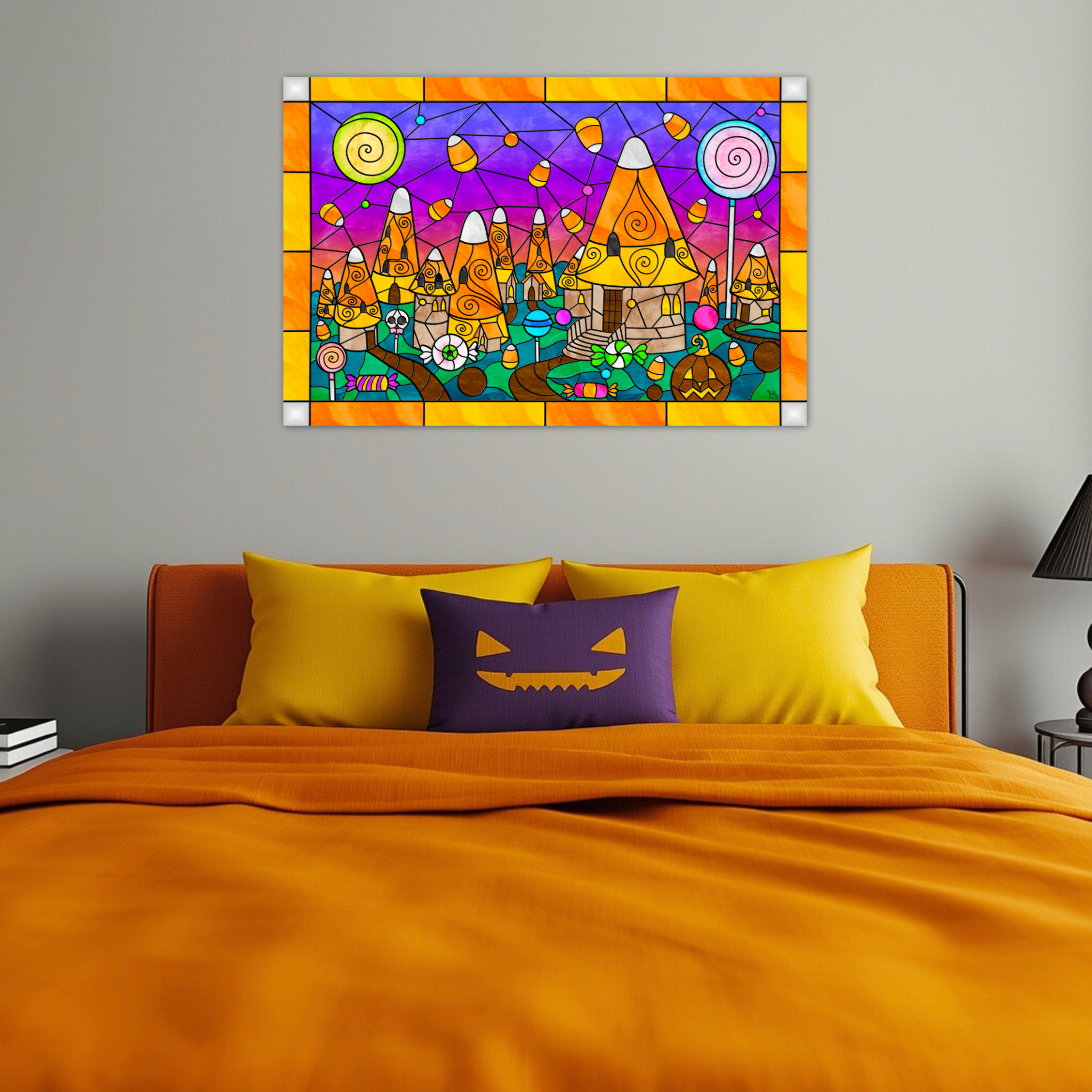 Step into a delightfully spooky world with this stained-glass–style digital Halloween Candyland landscape. Vibrant houses made from candy corn, lollipops, chocolates, and wrapped treats line winding paths in a playful, whimsical setting that celebrates the fun and magic of Halloween. Each candy-filled detail glows with jewel-toned color, bringing the scene to life with warmth, charm, and fantasy.
