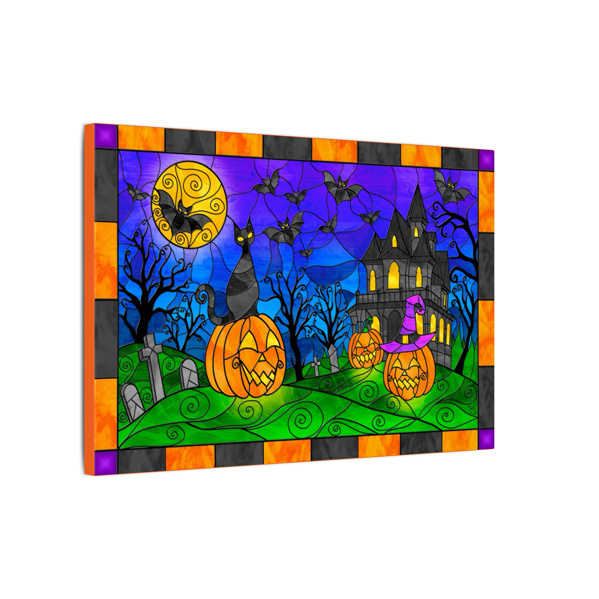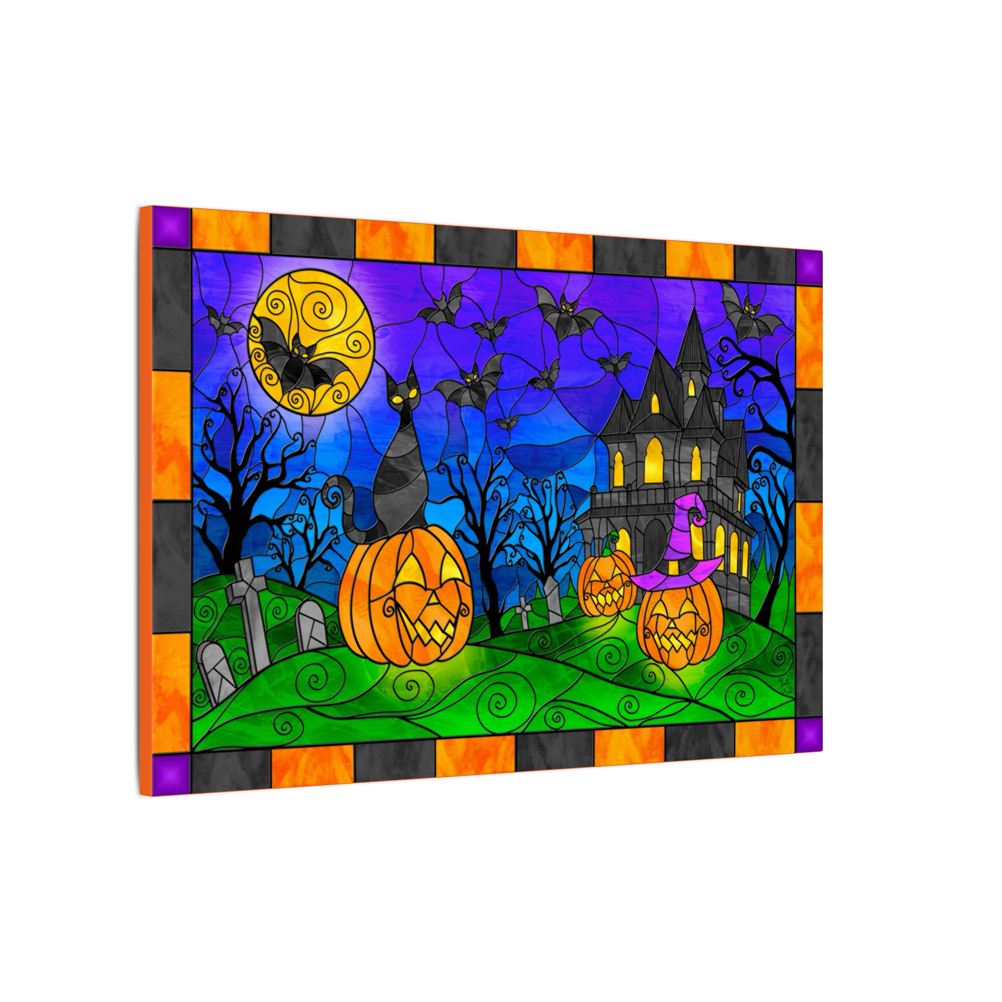 Printed on high-quality canvas, the artwork showcases vibrant, radiant colors and the depth of illuminated stained glass, making the entire scene feel alive with Halloween spirit. This is one-of-a-kind art made entirely by me, offering a unique and striking addition to your seasonal décor collection.