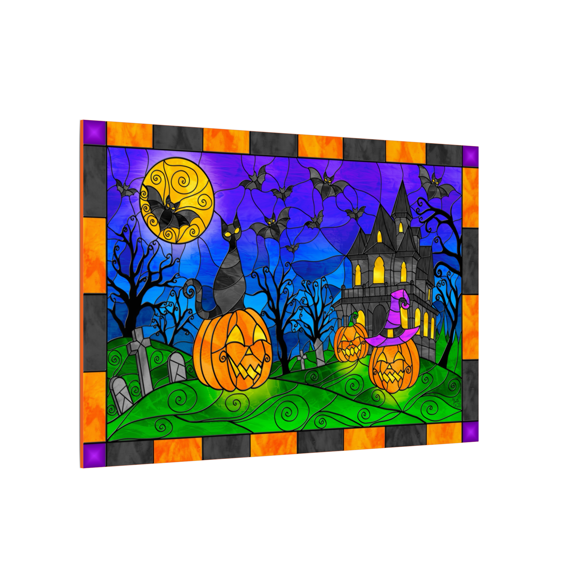 Set the perfect spooky atmosphere with this stained-glass–style digital Halloween landscape, featuring glowing jack-o’-lanterns, a curious black cat, and swirling black trees that frame a hauntingly beautiful night. In the distance, a silhouette of a haunted house rises against a large yellow moon, while bats glide across the sky above an eerie graveyard. The scene glows with rich color and luminous detail, capturing the enchantment and mystery of Halloween night.