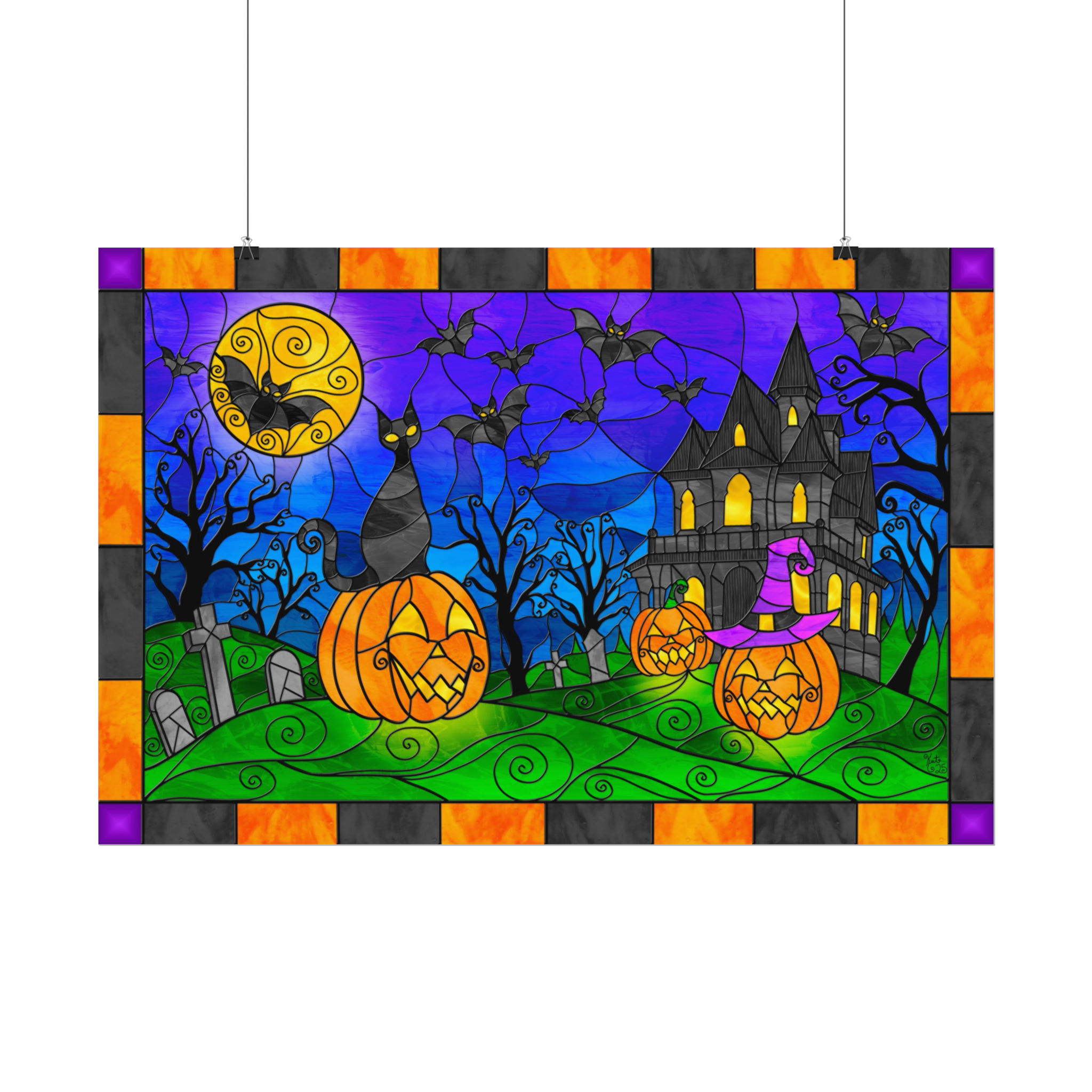 Printed on high-quality poster, the artwork showcases vibrant, radiant colors and the depth of illuminated stained glass, making the entire scene feel alive with Halloween spirit. This is one-of-a-kind art made entirely by me, offering a unique and striking addition to your seasonal décor collection.