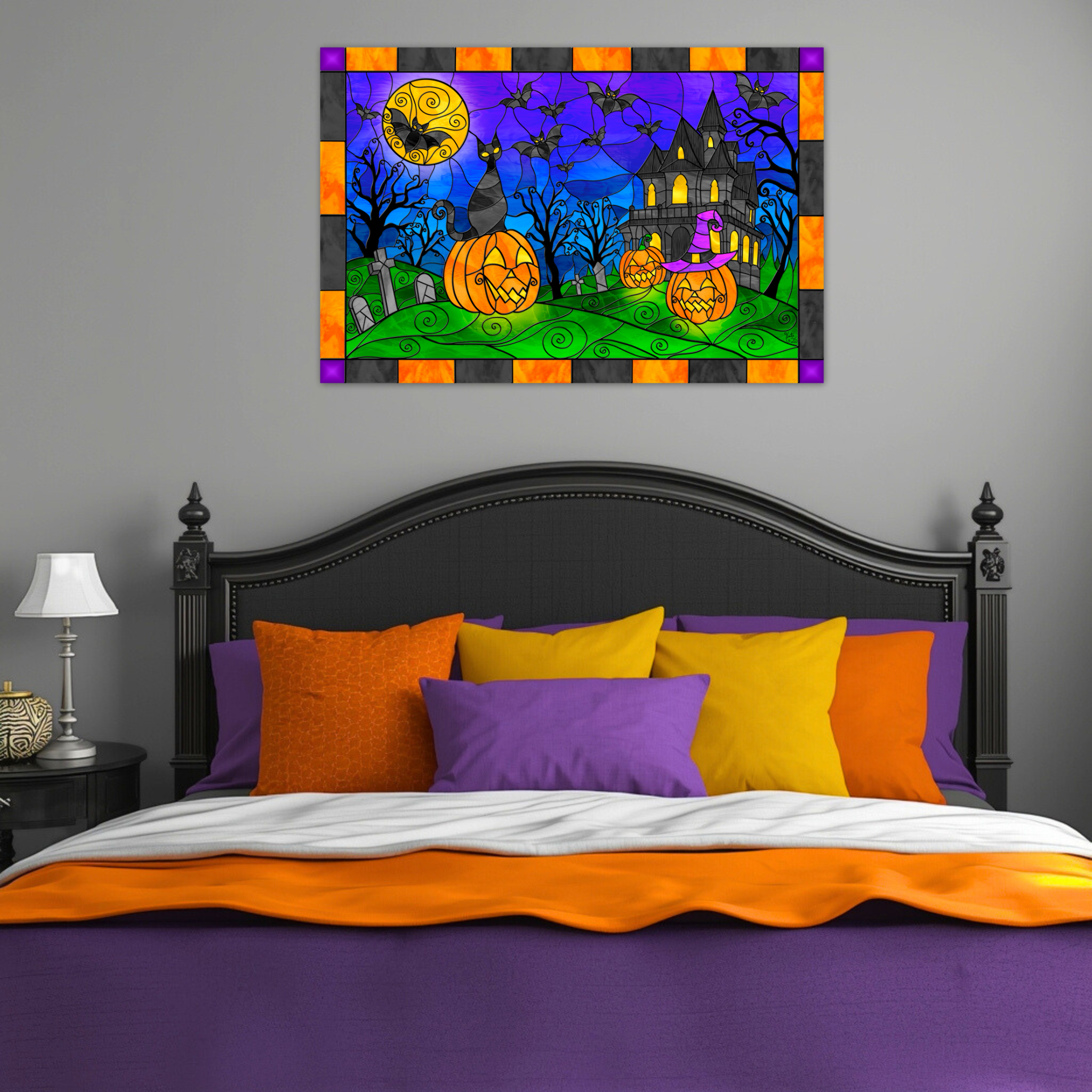 Set the perfect spooky atmosphere with this stained-glass–style digital Halloween landscape, featuring glowing jack-o’-lanterns, a curious black cat, and swirling black trees that frame a hauntingly beautiful night. In the distance, a silhouette of a haunted house rises against a large yellow moon, while bats glide across the sky above an eerie graveyard. The scene glows with rich color and luminous detail, capturing the enchantment and mystery of Halloween night.