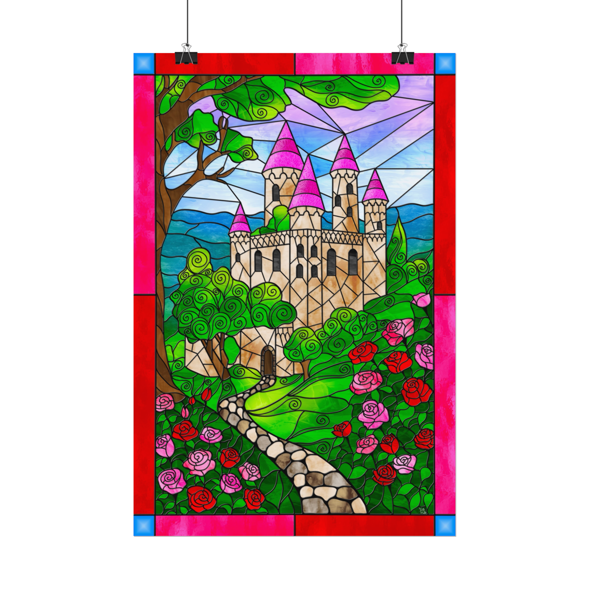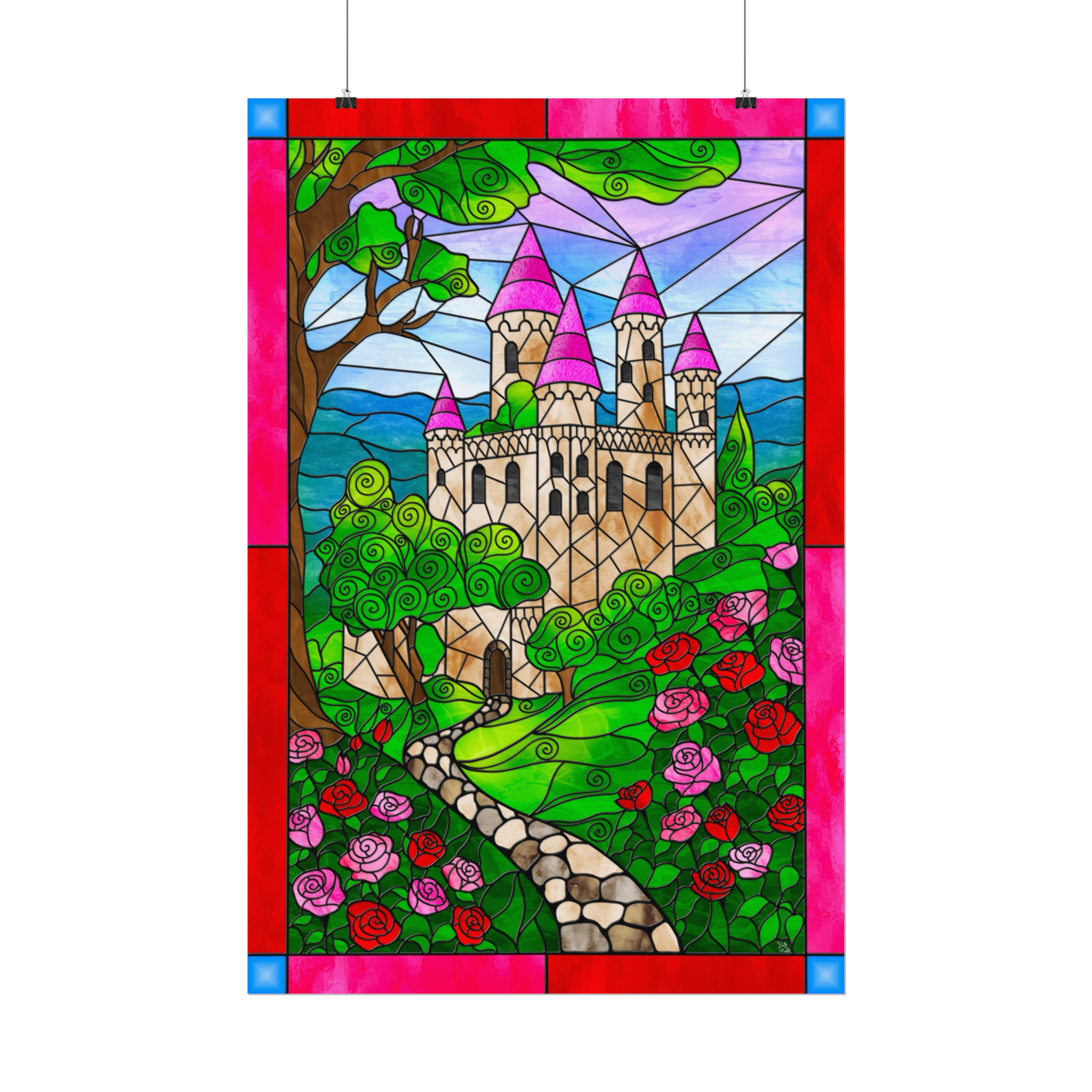 This poster showcases original artwork by the artist, thoughtfully designed in a signature stained-glass fantasy style. Every rose petal, hillside curve, and castle detail was carefully illustrated to evoke serenity, romance, and classic storybook charm. The artwork includes the artist’s signature, adding authenticity and a refined finishing touch.