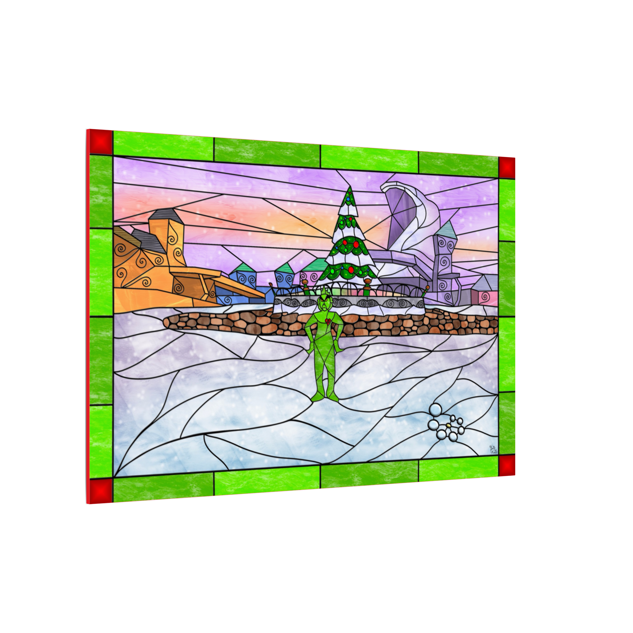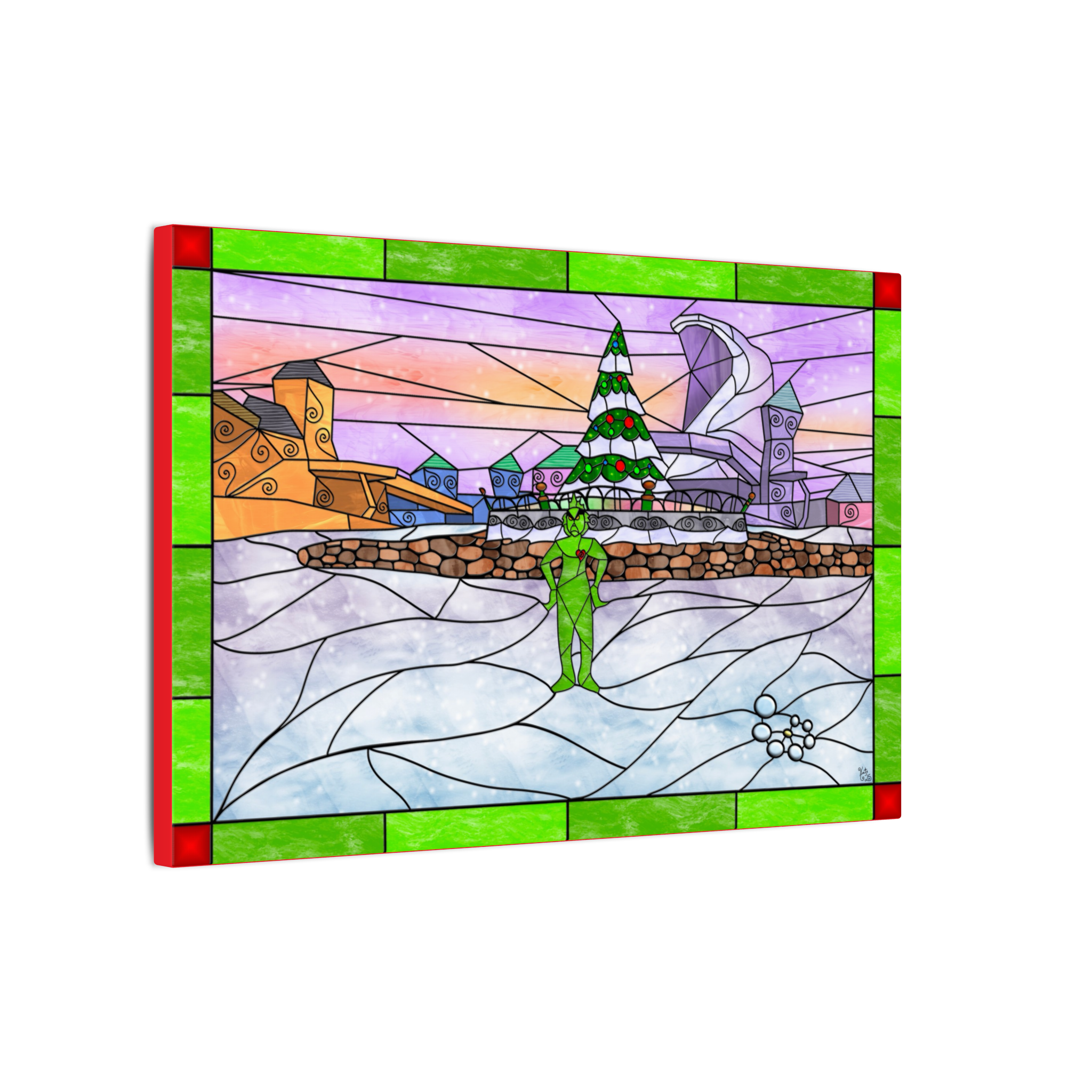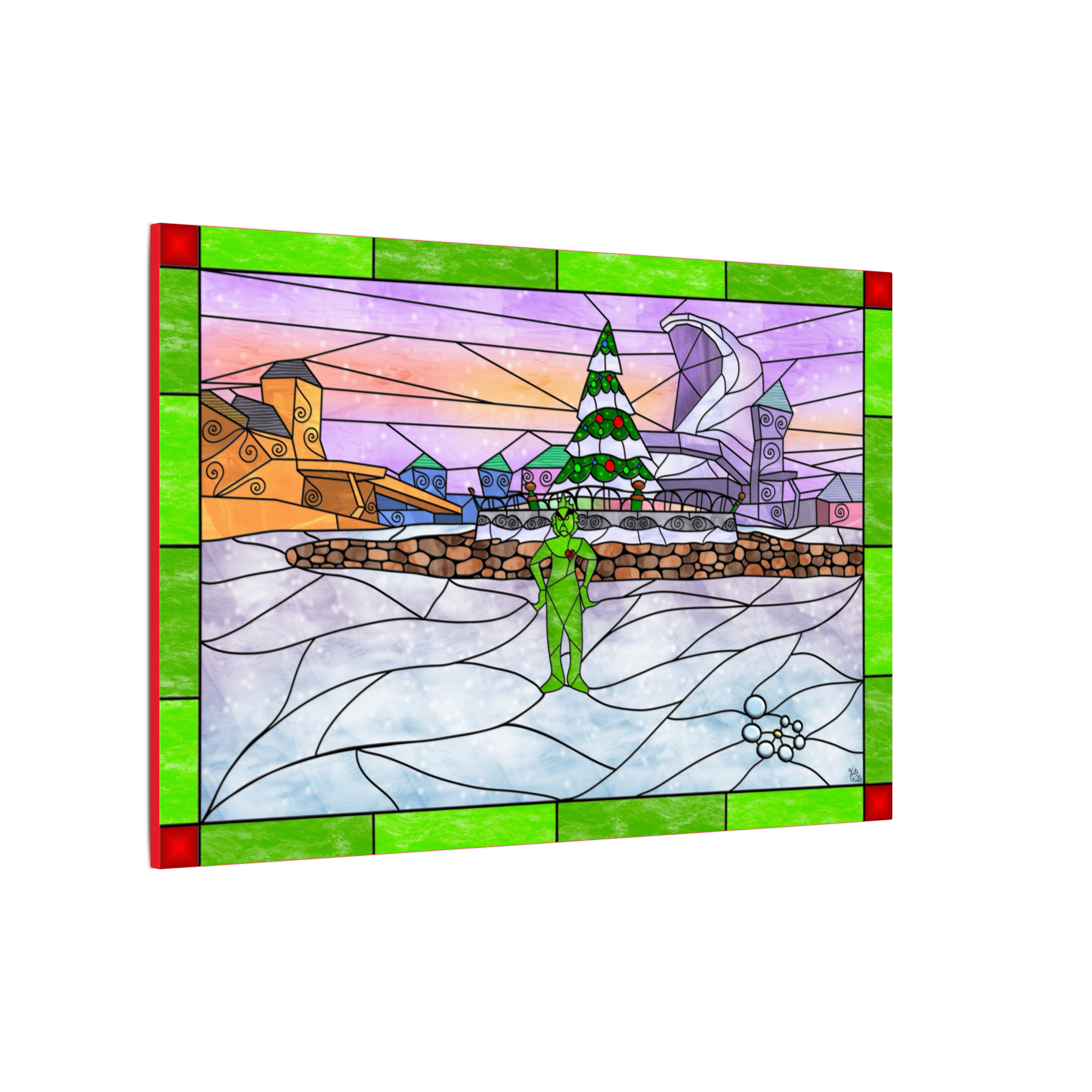 Bring playful holiday charm into your space with this stained-glass–style digital landscape canvas featuring a whimsical winter village filled with curved rooftops, glowing windows, and festive cheer. At the center of the scene stands a mischievous green figure, framed by a decorated Christmas tree glowing softly behind him. A small red heart on his chest adds a warm, meaningful contrast, giving the artwork a balance of humor, emotion, and holiday magic.